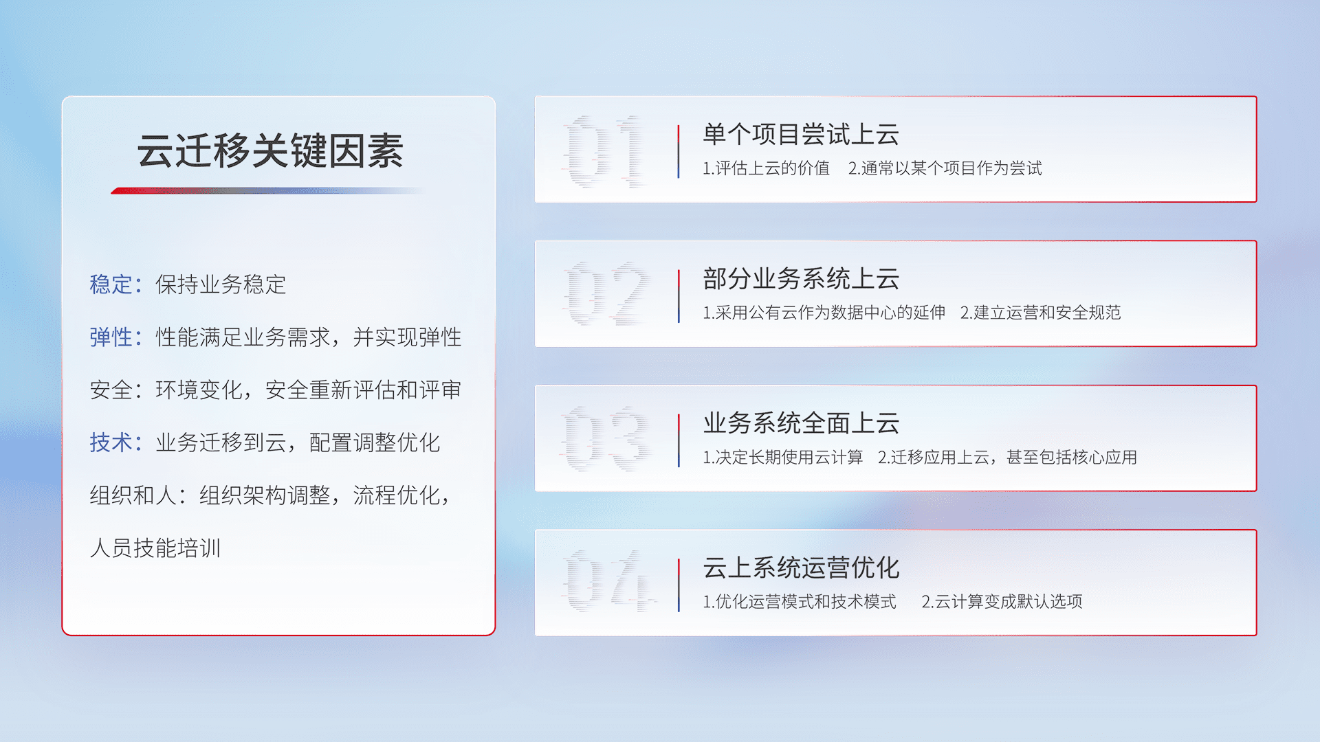 结合实际业务,,从规划设计、、、、云平台选型、、、云原生改造、、数据迁移、、、集成交付,,迁移全过程为客户识别最佳上云路径,,,做好风险识别管理,,,设计网络架构、、、身份权限、、、安全审计合规、、、操作审计、、、、日志审计、、、、监控告警策略、、、、多站点容灾设计等,,对云上基础设施进行整体规划,,,,提升IT治理水平,,,,以满足弹性、、高可用、、、高性能的需求。。。