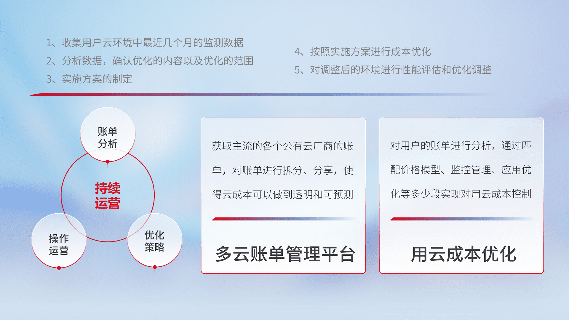 通过多云纳管,,以统一的资源数据模型把客户的云资源进行抽象和封装,,进而实现对多云资源的统一操作,,保障云资源管理的可靠性、、稳定性与可用性。。量身定制化运维内容,,,,配置、、开发运维、、、、补丁管理、、、备份、、监控、、、认证和访问管理、、、审计和日常巡检等,,,保障在用云过程中的可靠度,,稳定度以及高可用率。。。。